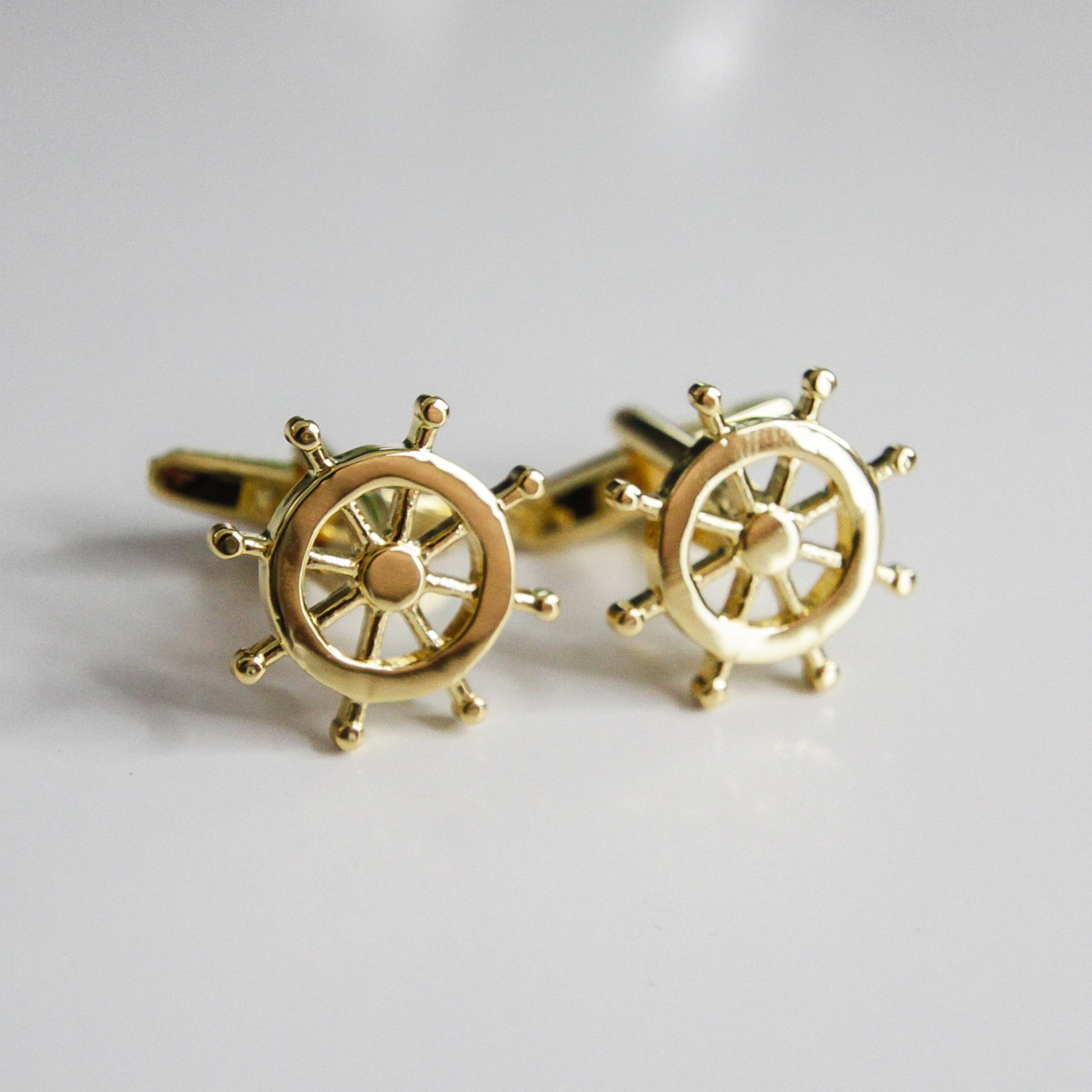 Steer your style in the right direction with these gold ship wheel cufflinks.