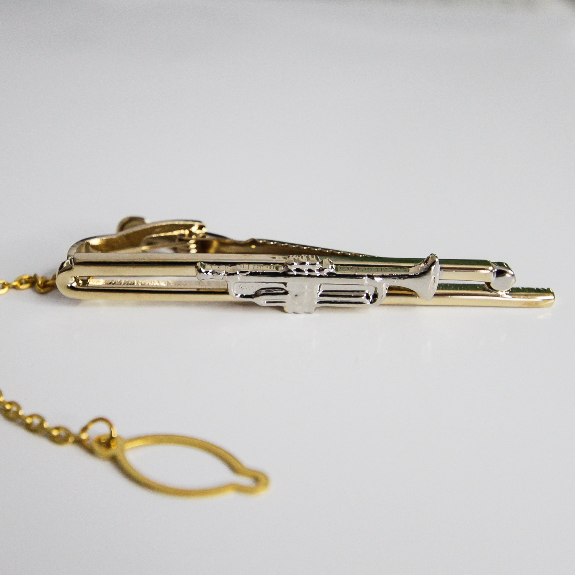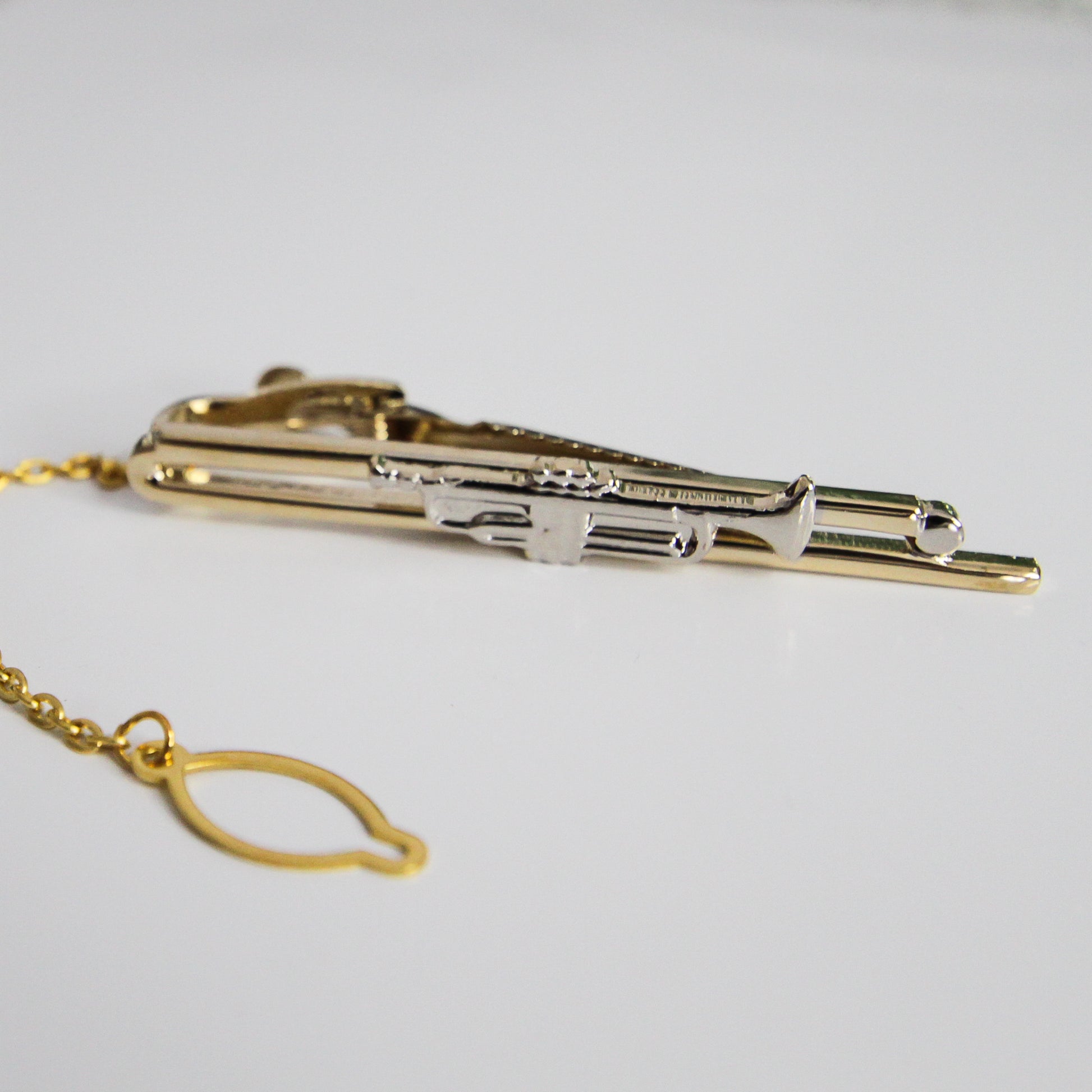 - Elegant tie bar with detailed silver trumpet on a gold-tone base